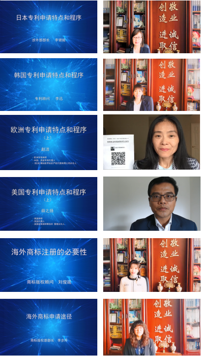 本次活動以八個獨立的短視頻,宣傳“海外知識產(chǎn)權(quán)保護”的必要性、申請的特點以及申請途經(jīng)等?;顒拥闹髦v人全部由海內(nèi)外具有多年知識產(chǎn)權(quán)從業(yè)經(jīng)驗的專業(yè)人士擔任,其中大連東方專利代理有限責任公司的主講人包括海外留學歸國博士、擁有近二十年代理經(jīng)驗的專利代理師及商標代理人等;海外知識產(chǎn)權(quán)專家則具有多國知識產(chǎn)權(quán)服務(wù)經(jīng)驗,擅長跨國知識產(chǎn)權(quán)服務(wù)業(yè)務(wù)。其中,在海外為我們錄制《歐洲專利申請?zhí)攸c和程序》的趙潔女士是歐洲專利律師、美國專利代理師,具有中國專利代理師資格,在歐洲、美國、和中國都有長期的工作經(jīng)驗。同樣在海外為我們錄制《美國專利申請?zhí)攸c和程序》的薛之揚博士是美國律師和專利代理師,是中國科學院知識產(chǎn)權(quán)培訓班外籍講員。