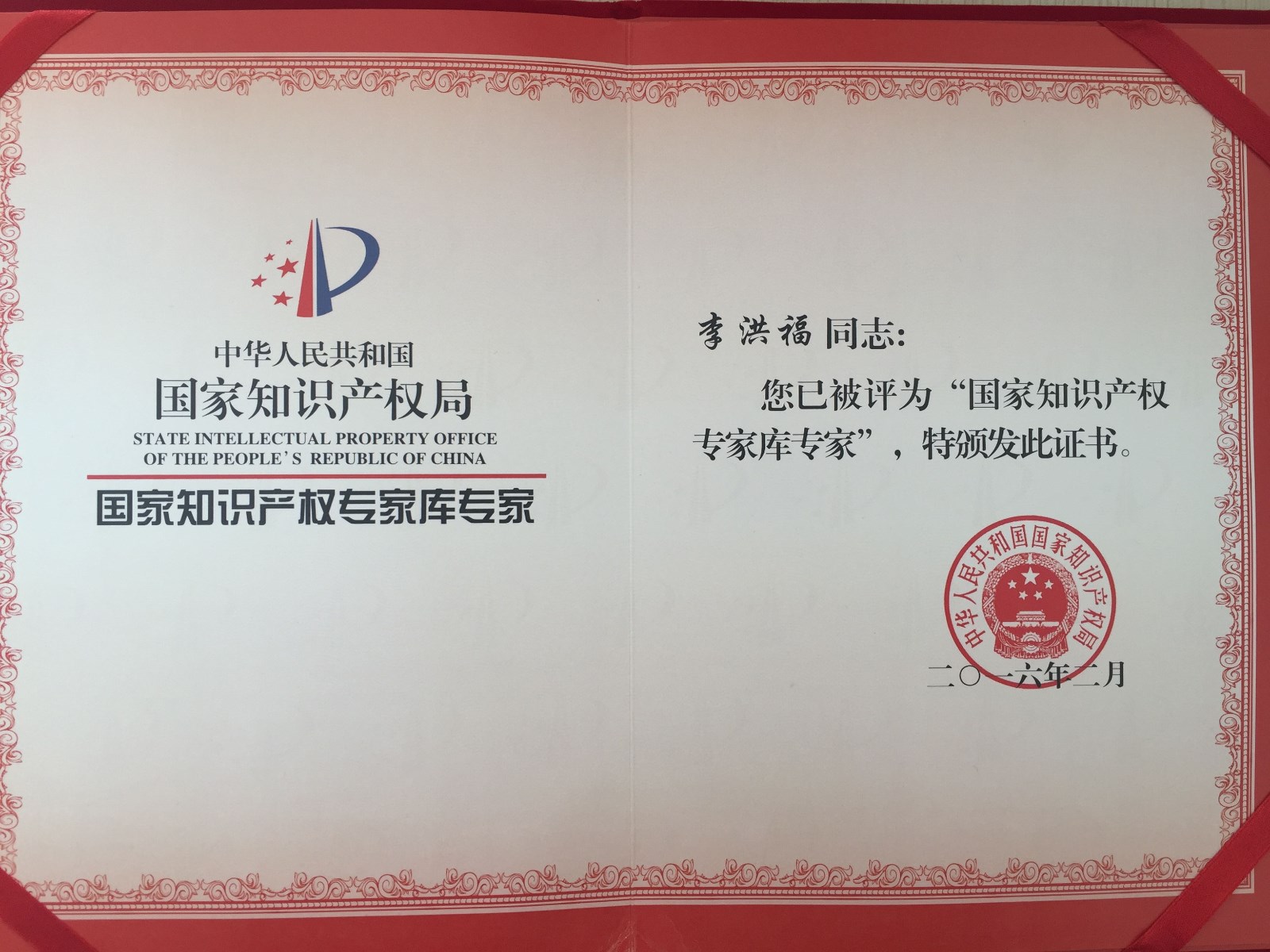 (2016年,李洪福董事長(zhǎng)被國(guó)家知識(shí)產(chǎn)權(quán)專(zhuān)利局評(píng)為“國(guó)家知識(shí)產(chǎn)權(quán)專(zhuān)家?guī)鞂?zhuān)家”)